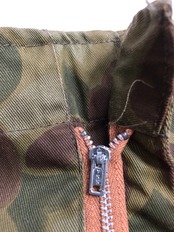 緑味の強いダックハンターカモ柄にややシャリ感と光沢感のある生地感がいい表情です。
