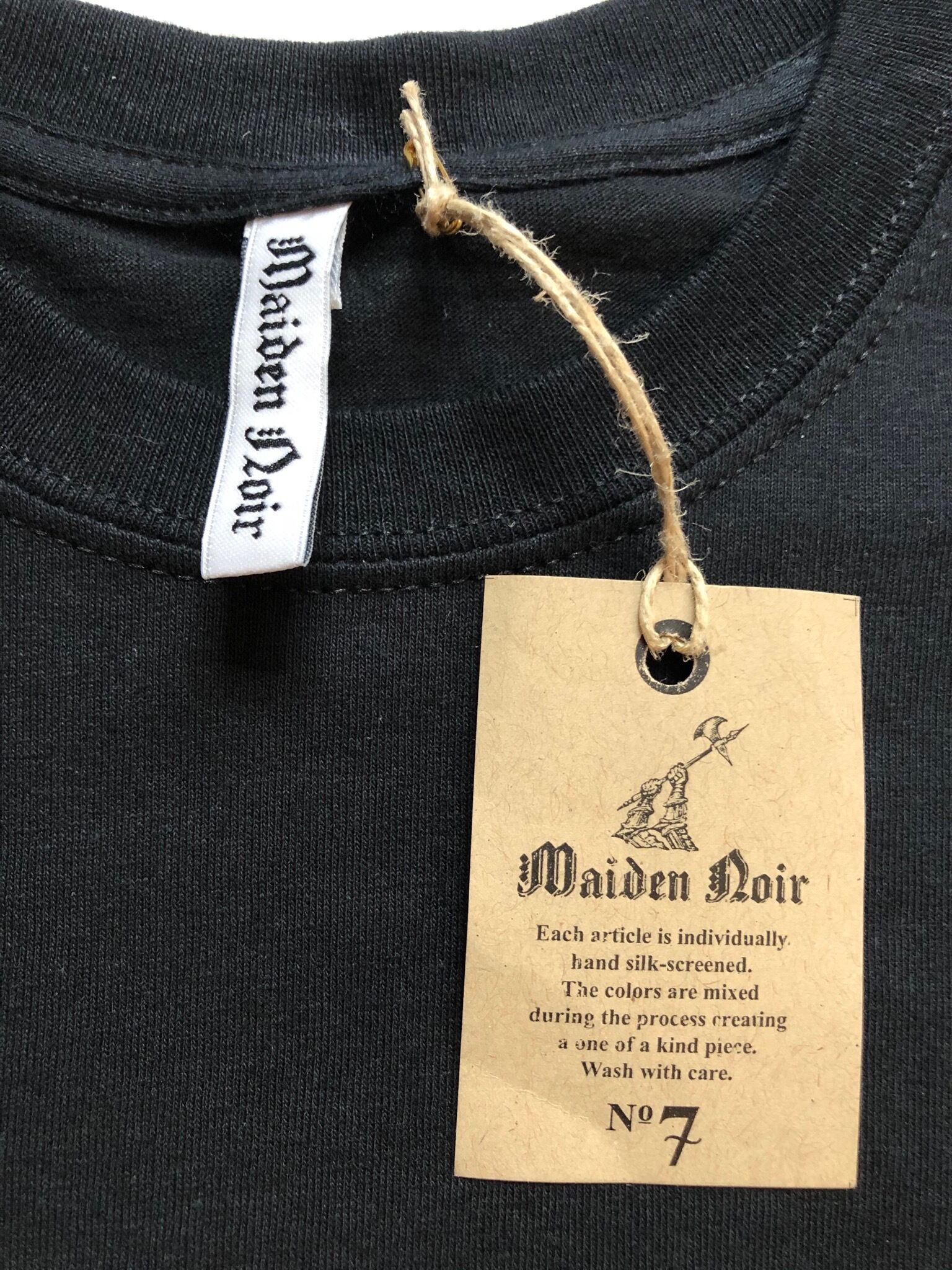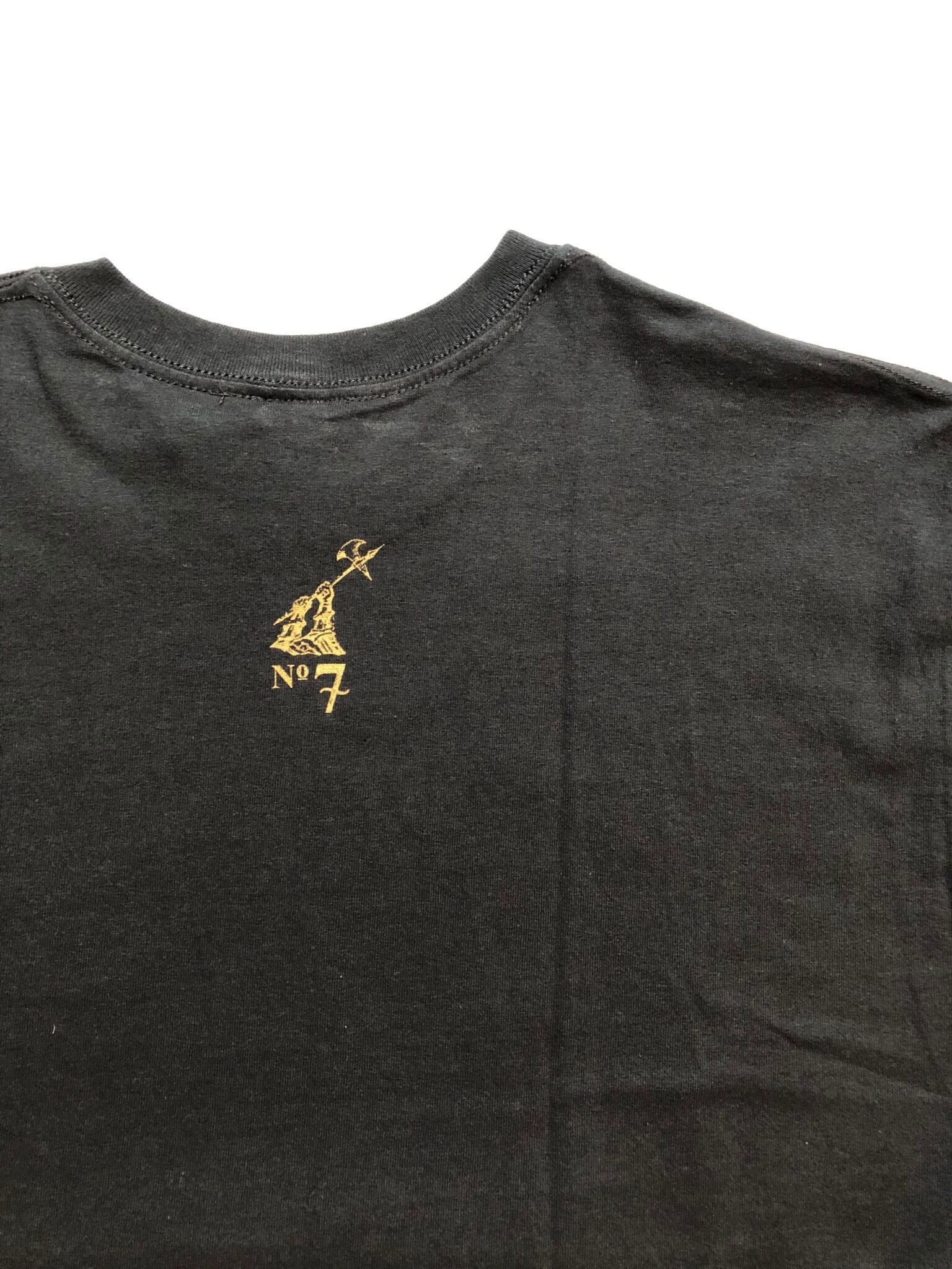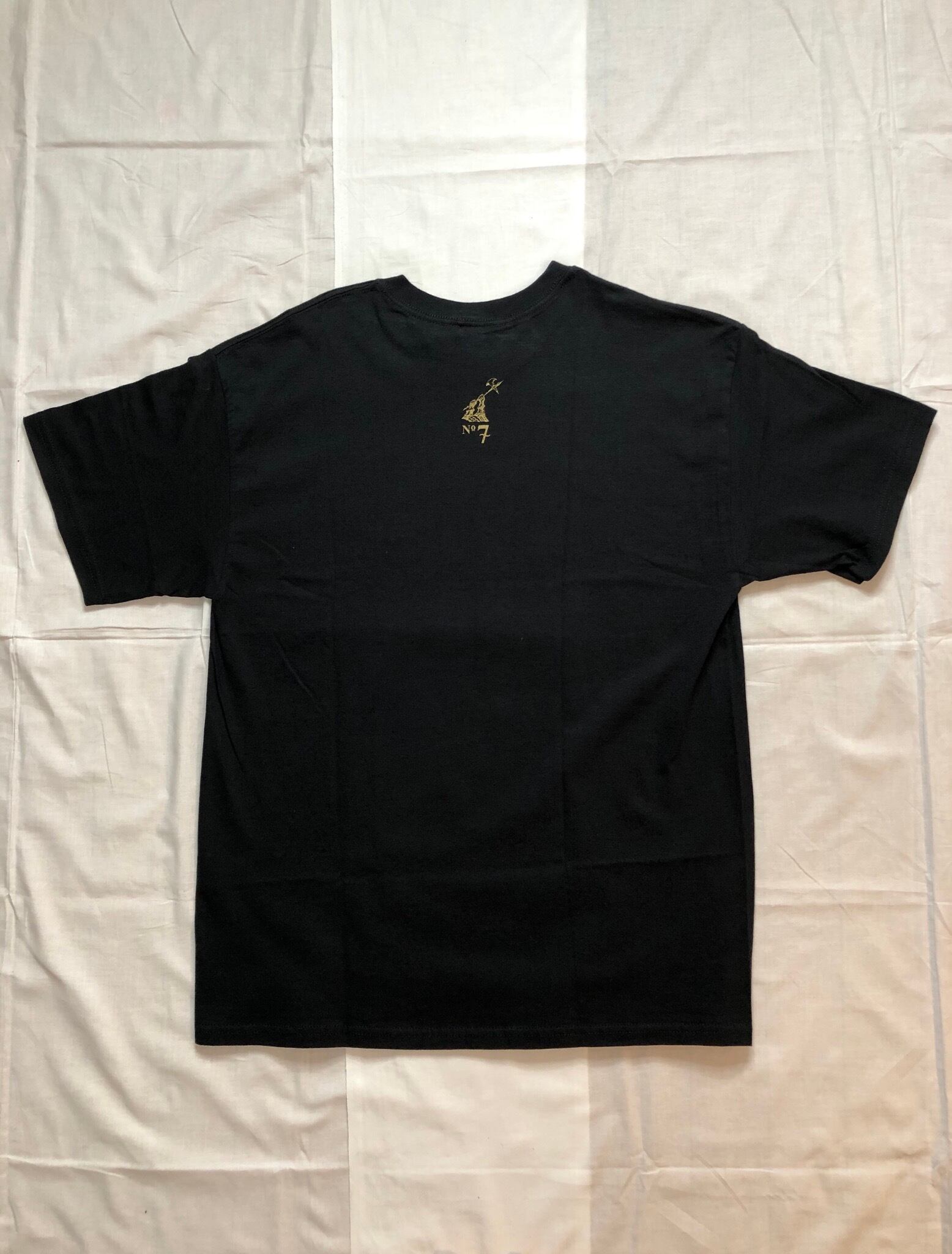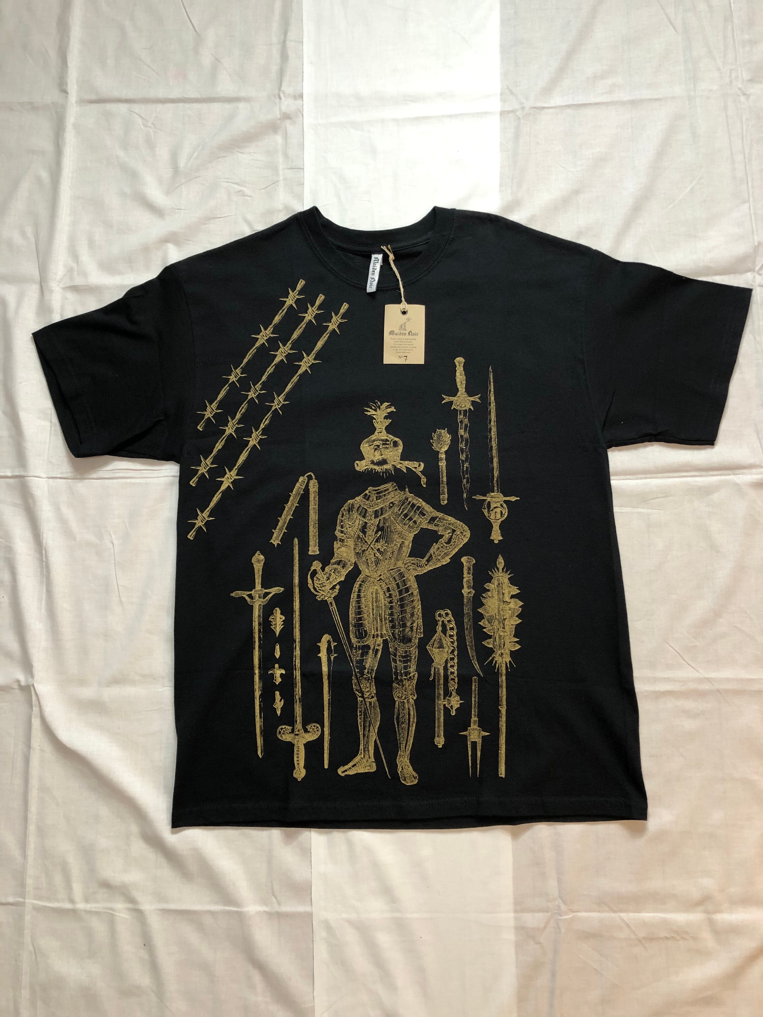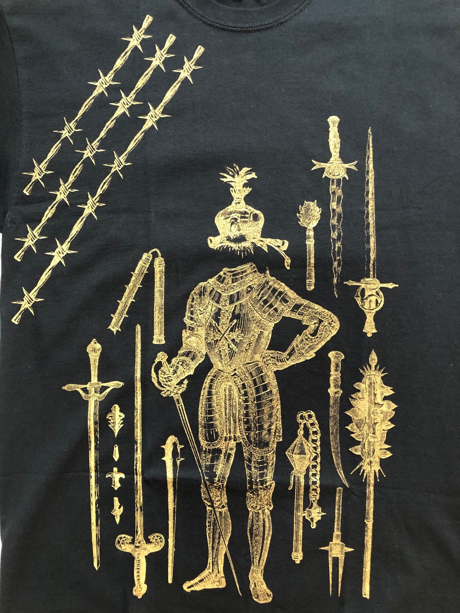 黒地のボディで前見頃全体に騎士の装備が金のプリントで描かれています。