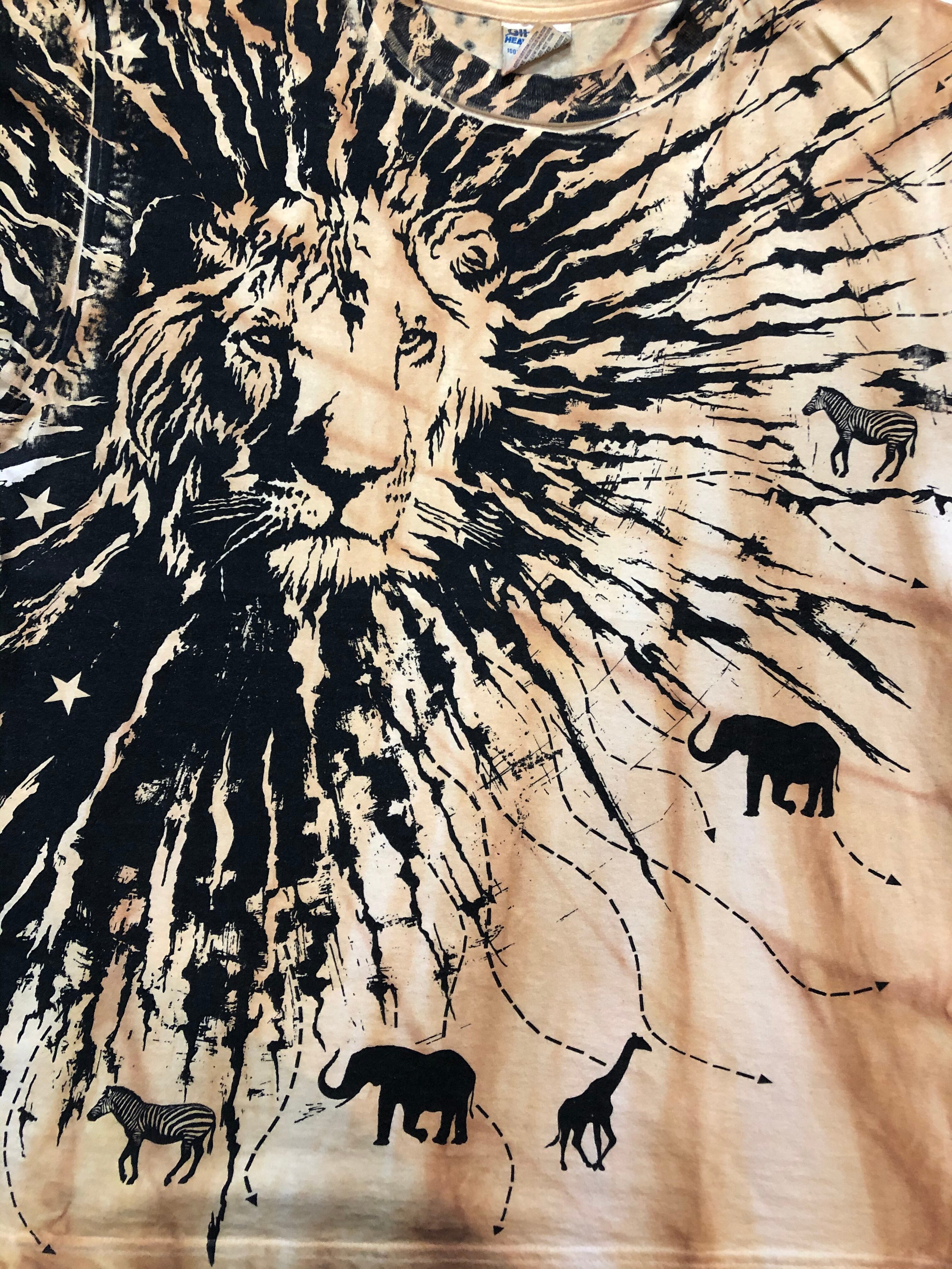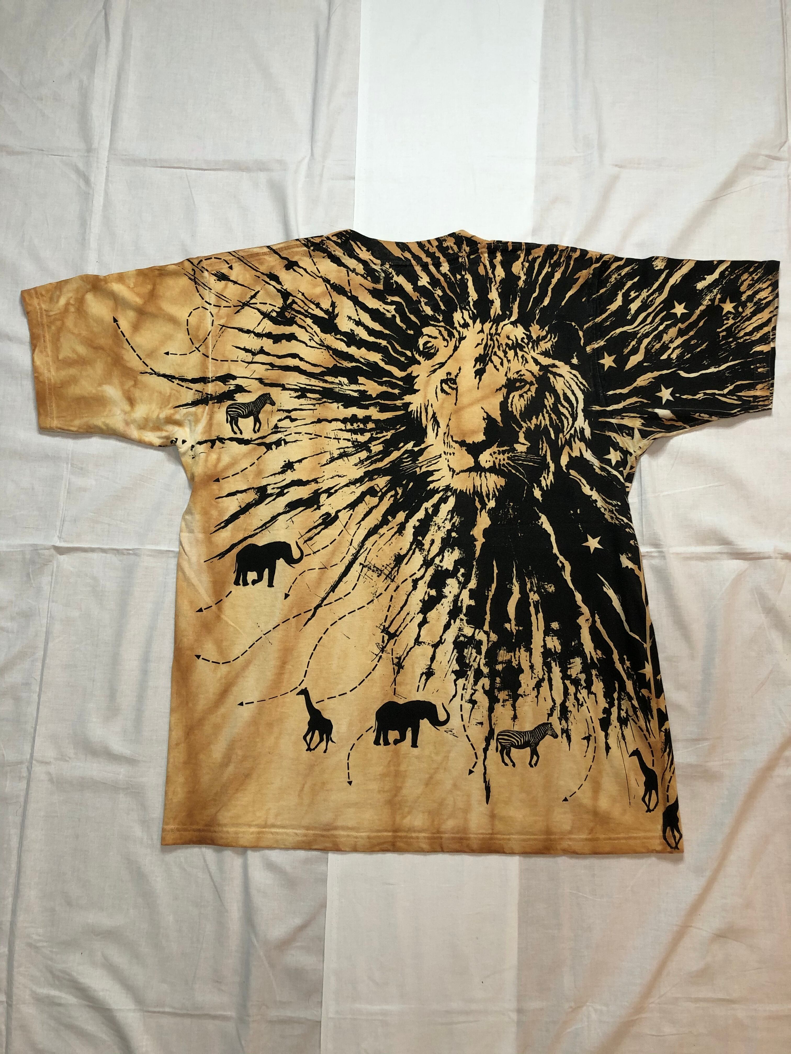 ライオンのプリントが前面に出ているタイダイカラーのプリントTシャツです。