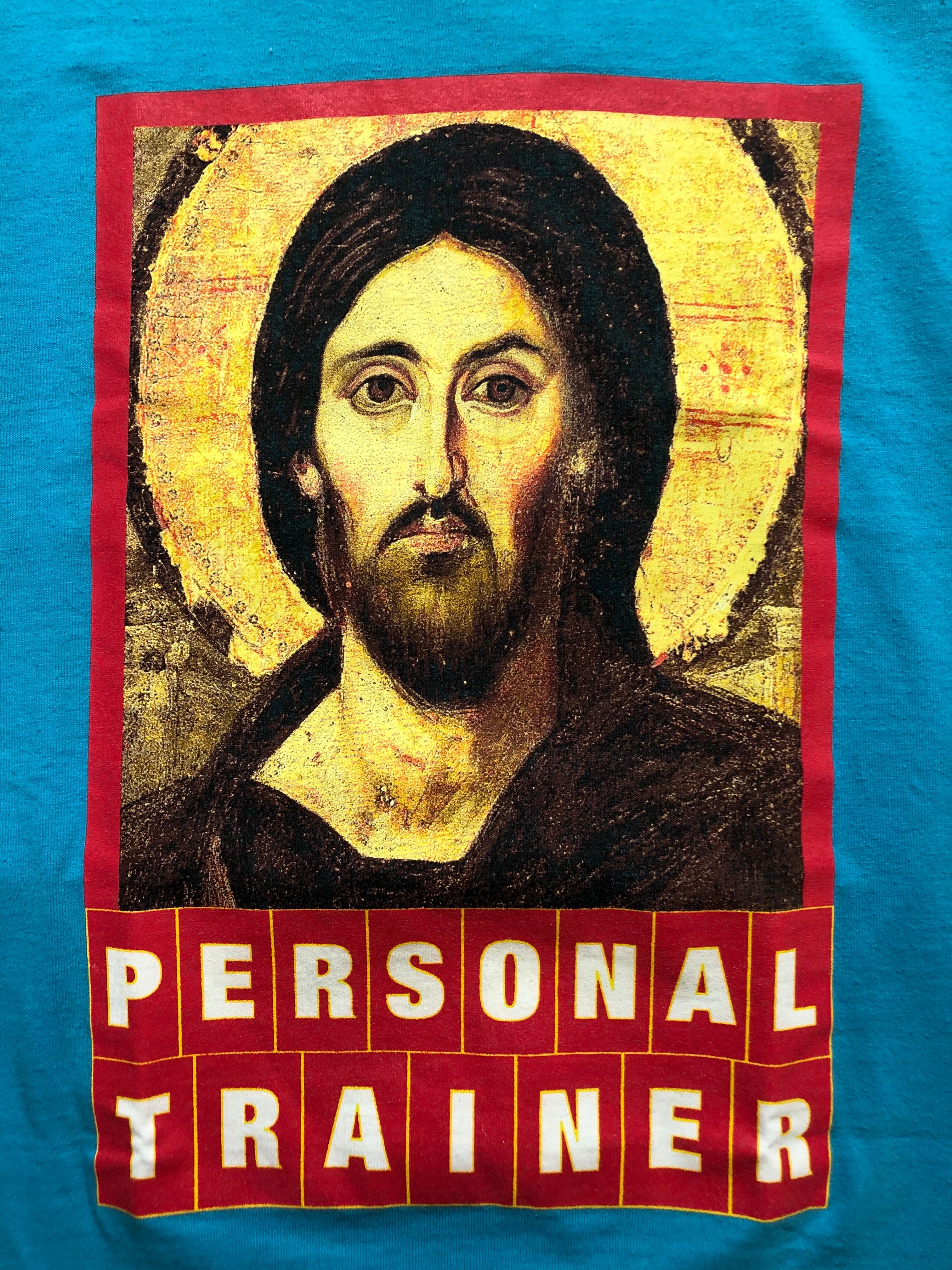 フロントにはキリストの肖像画とともに”PERSONAL TRAINER”という意味深な言葉がプリントされています。