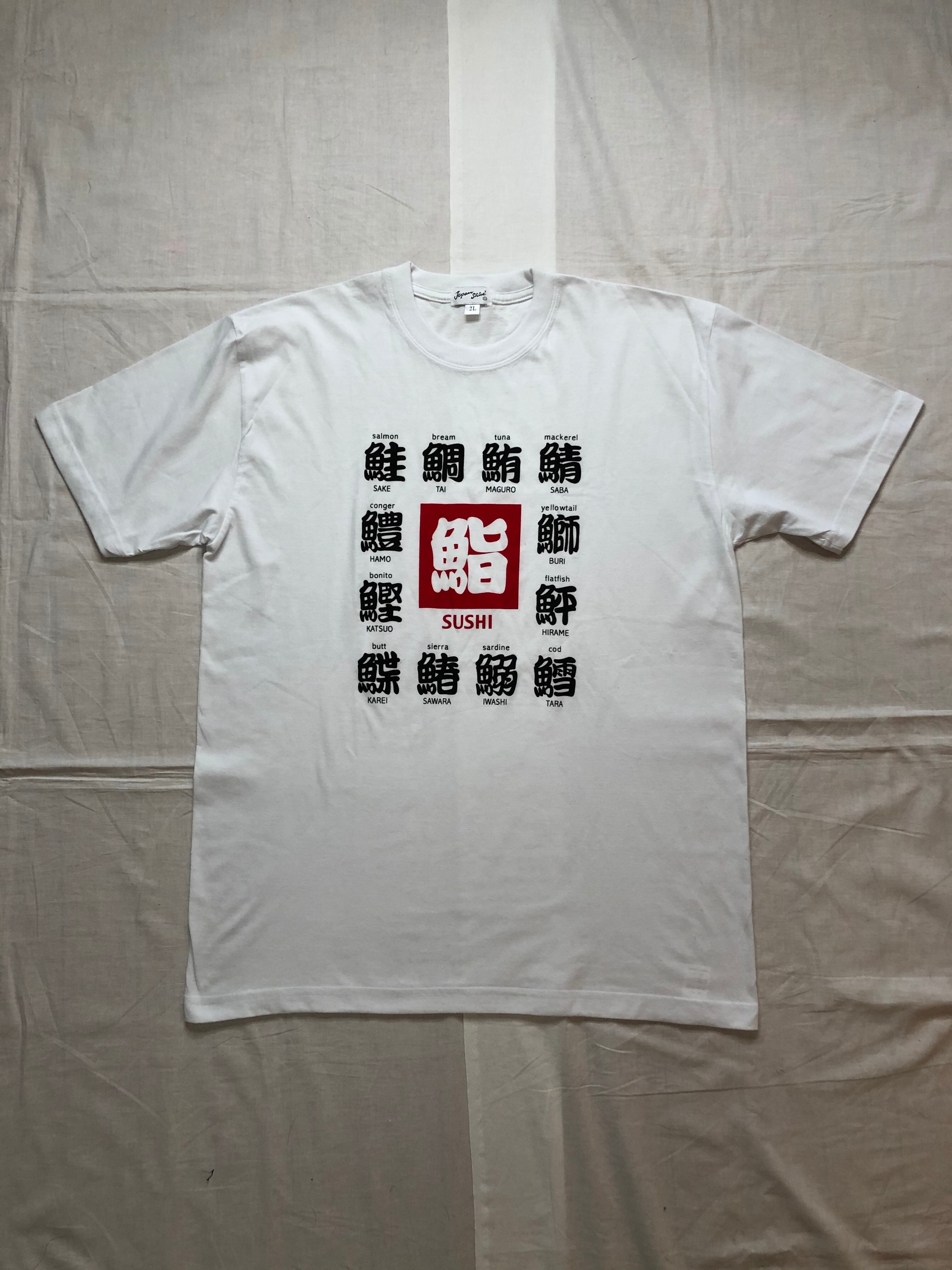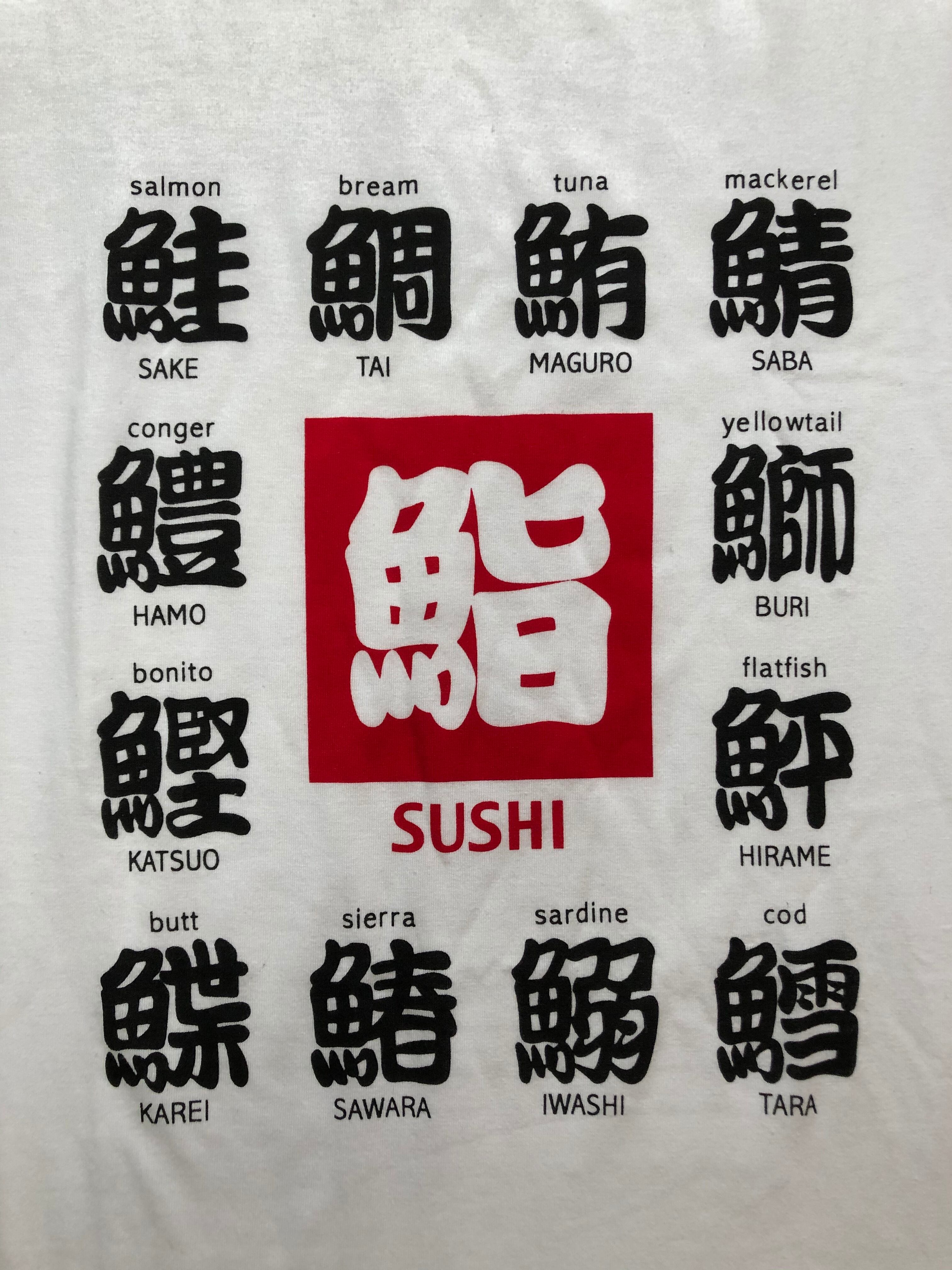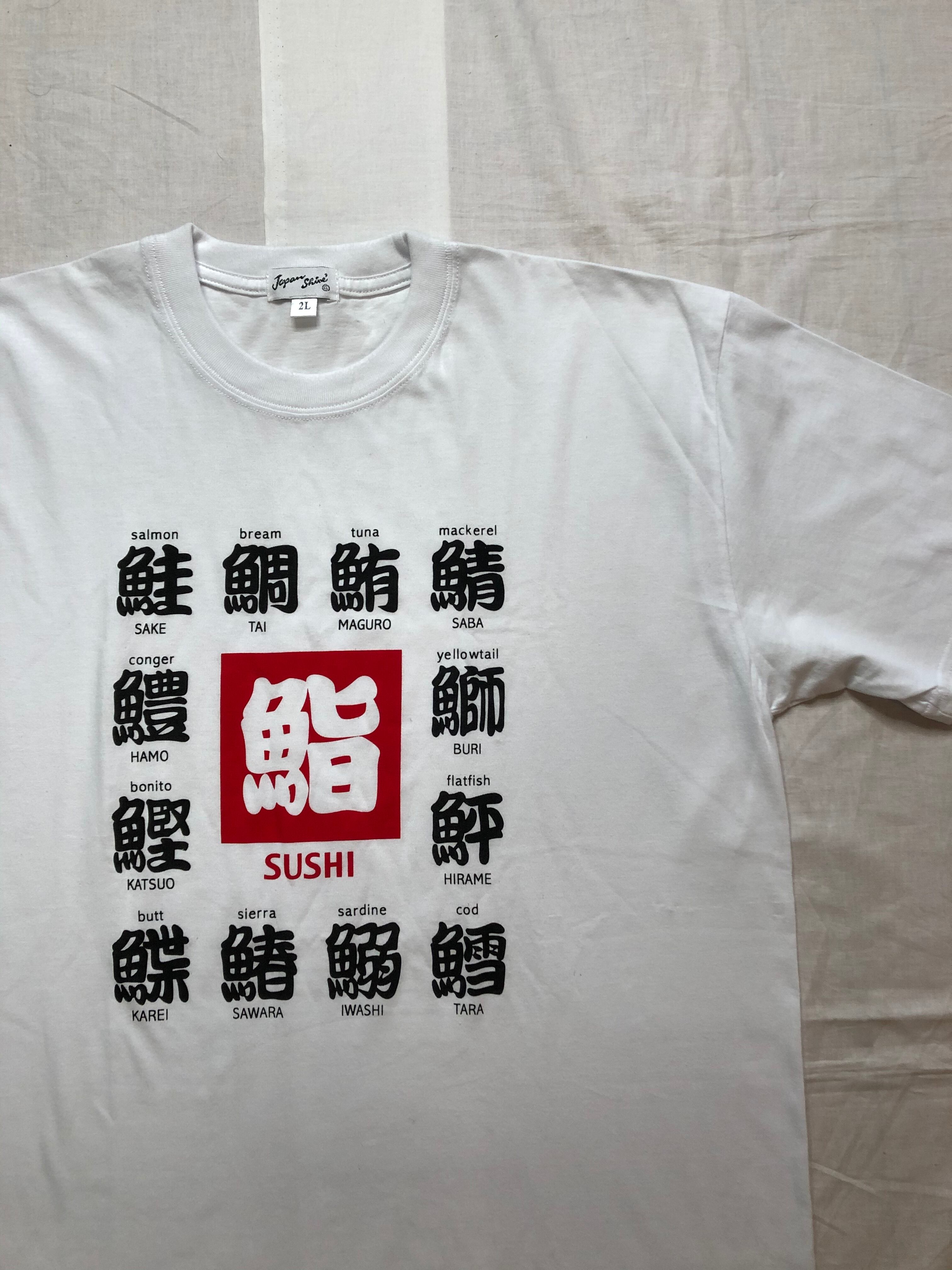 寿司ネタに関する漢字がプリントされているTシャツです。