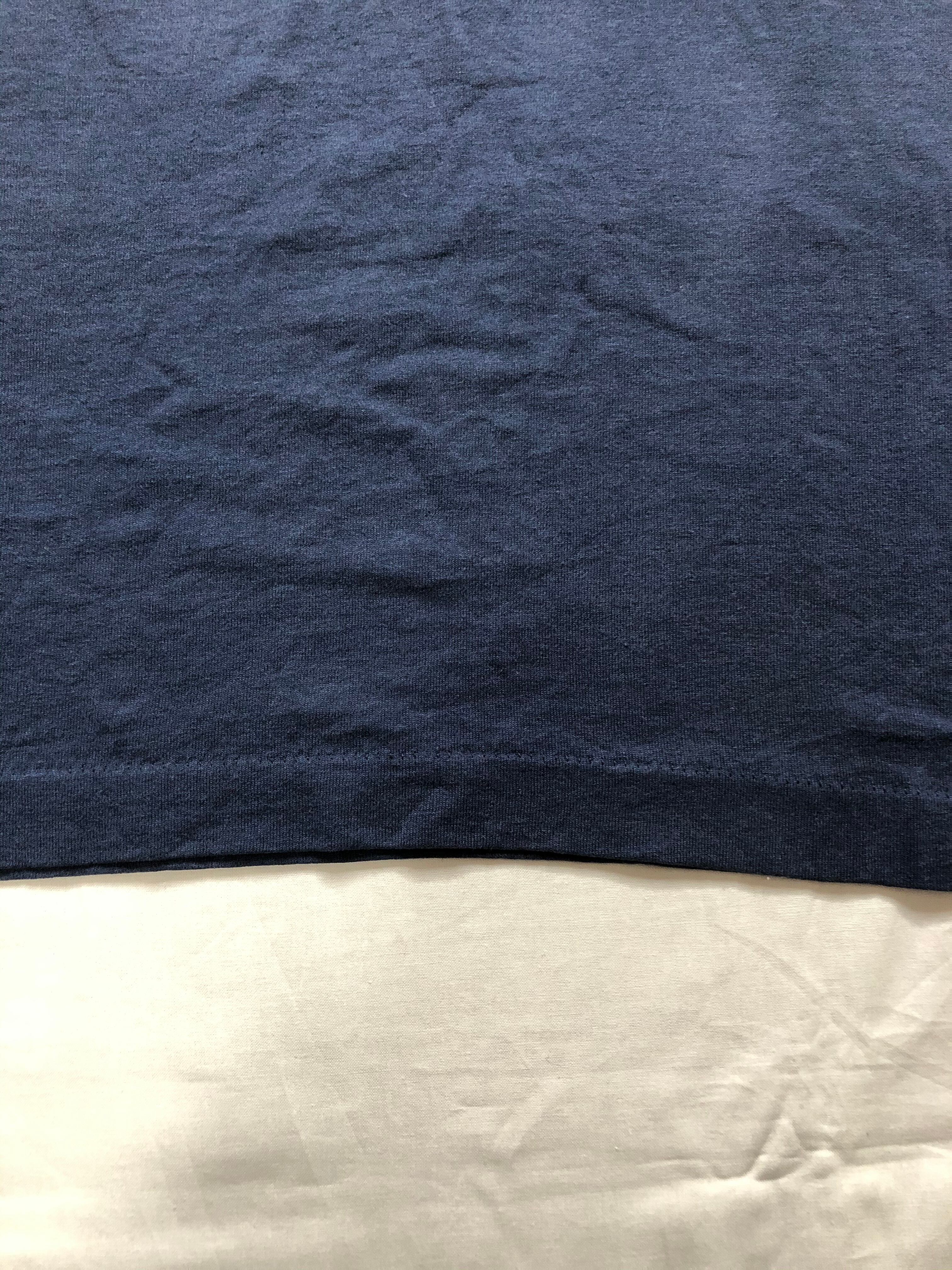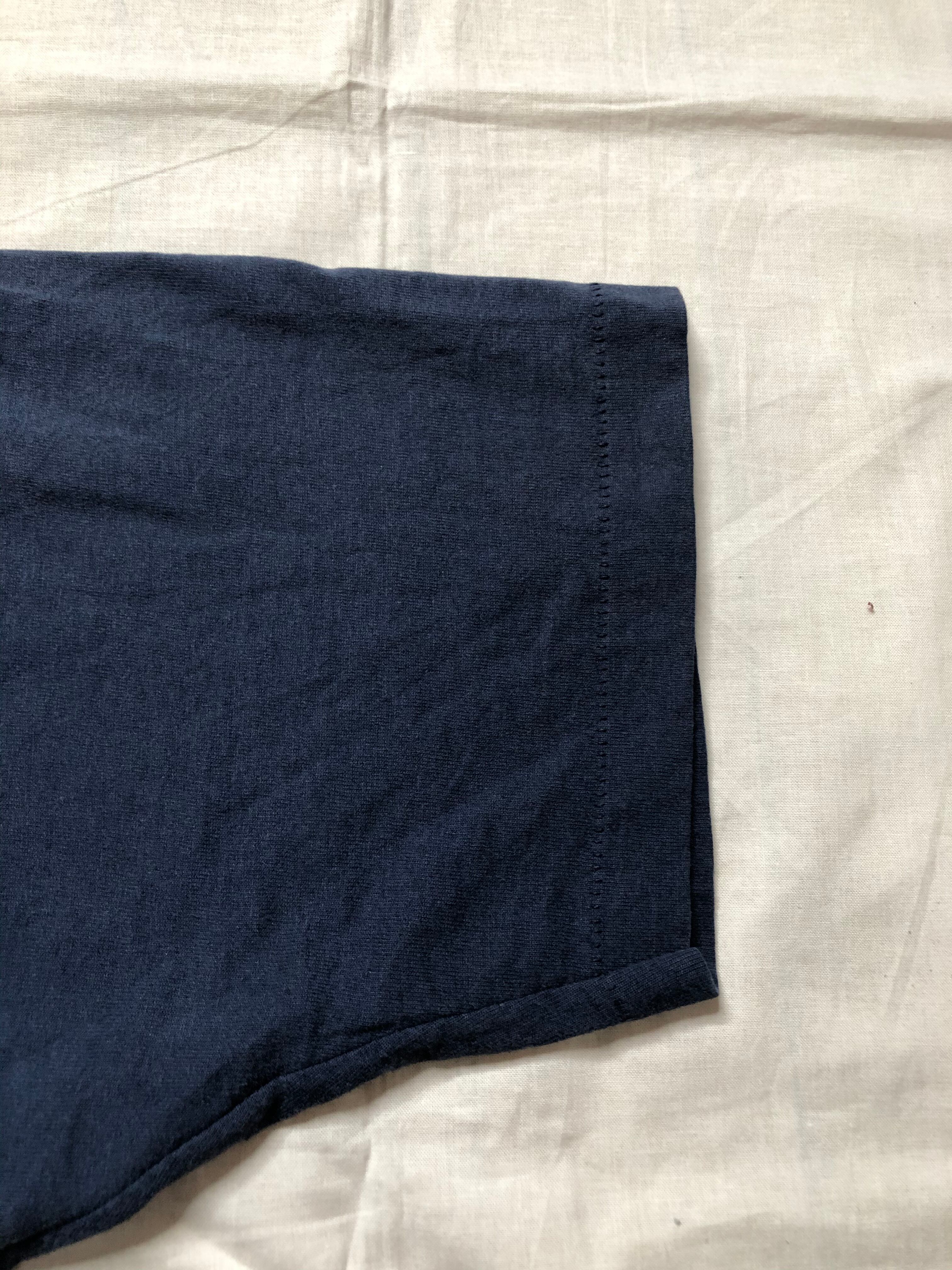 袖・裾ともにシングルステッチでコットンとポリエステルの50%・50%のいわゆる「ポリ混」の生地です。