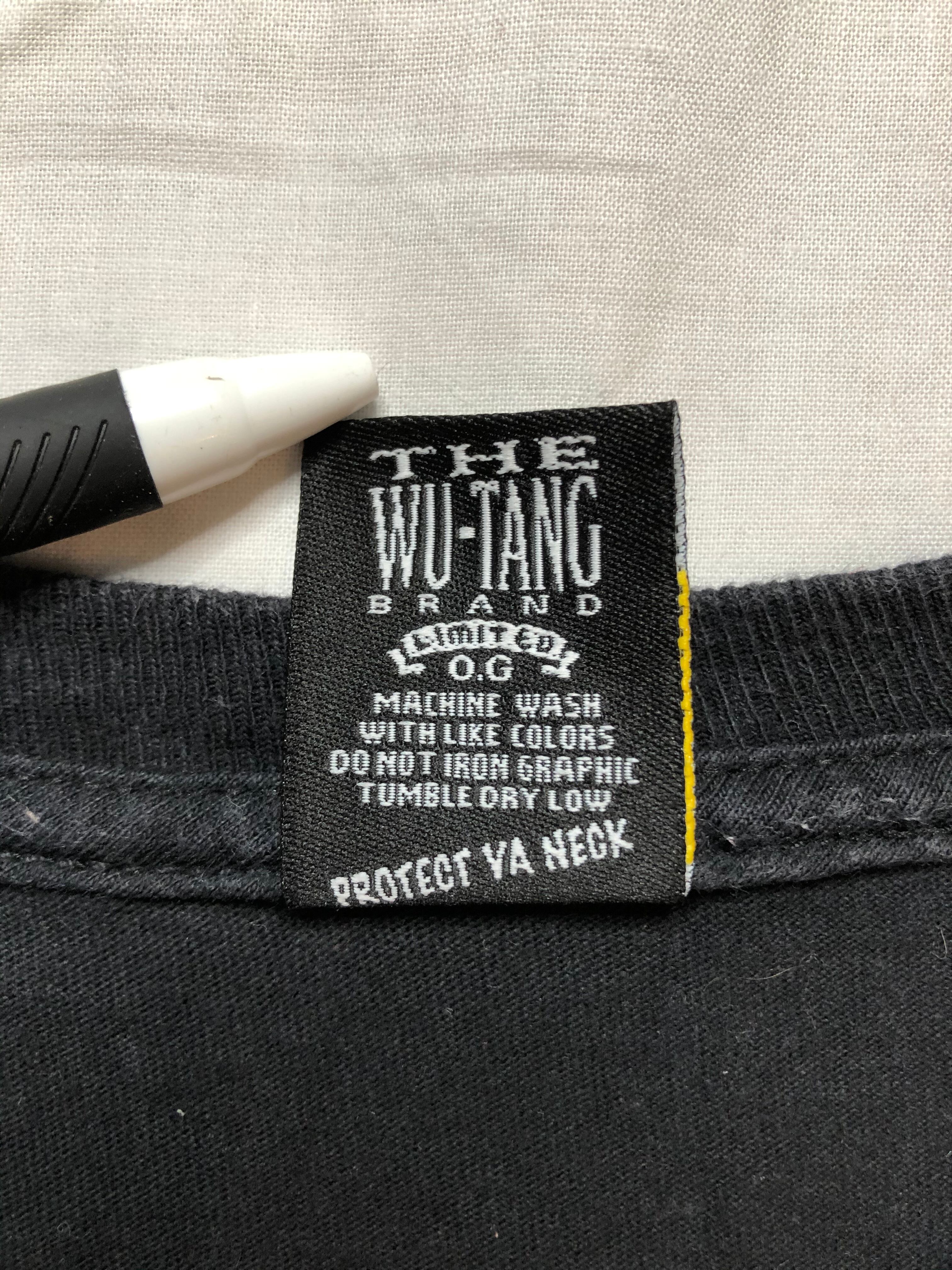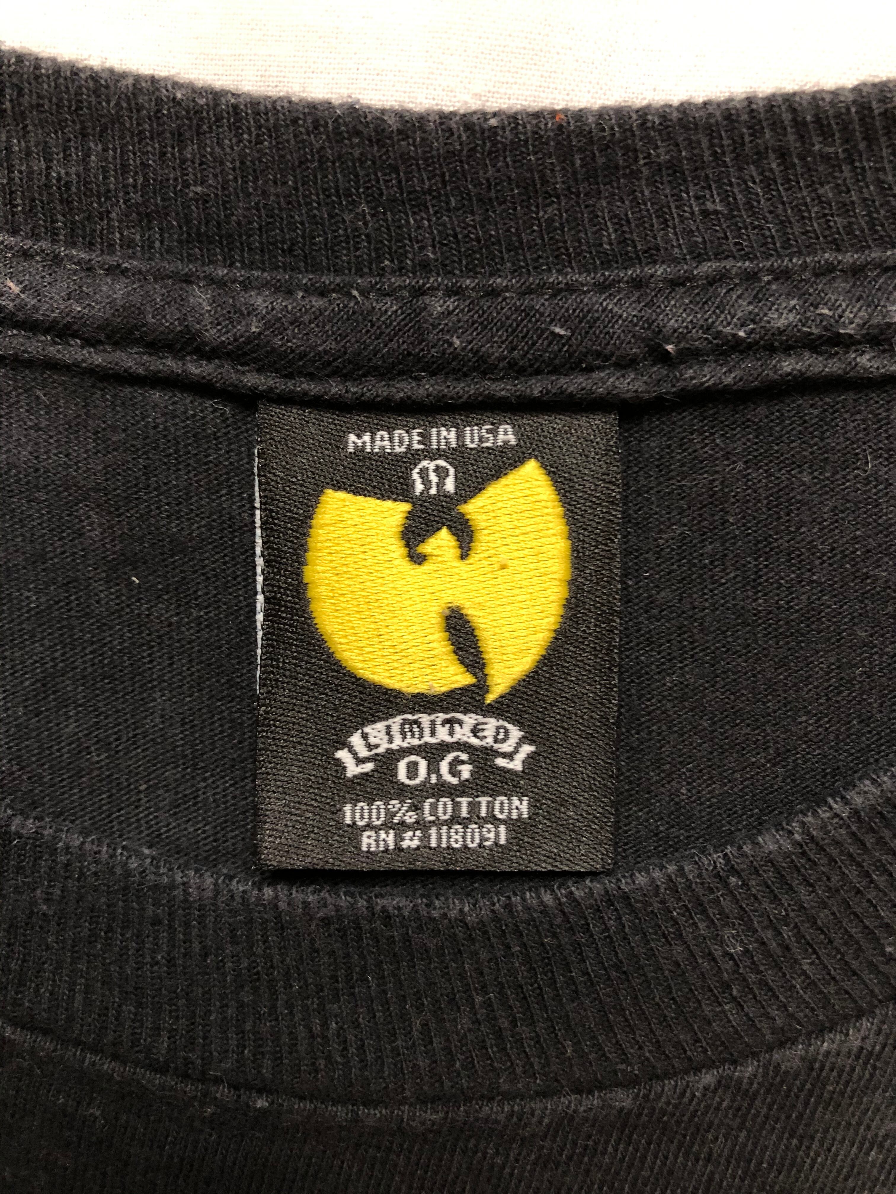 タグにはウータンクランのロゴマークと、「THE WU-TANG BRAND」の文字が入り、彼らの自主ブランド製であることがわかります。