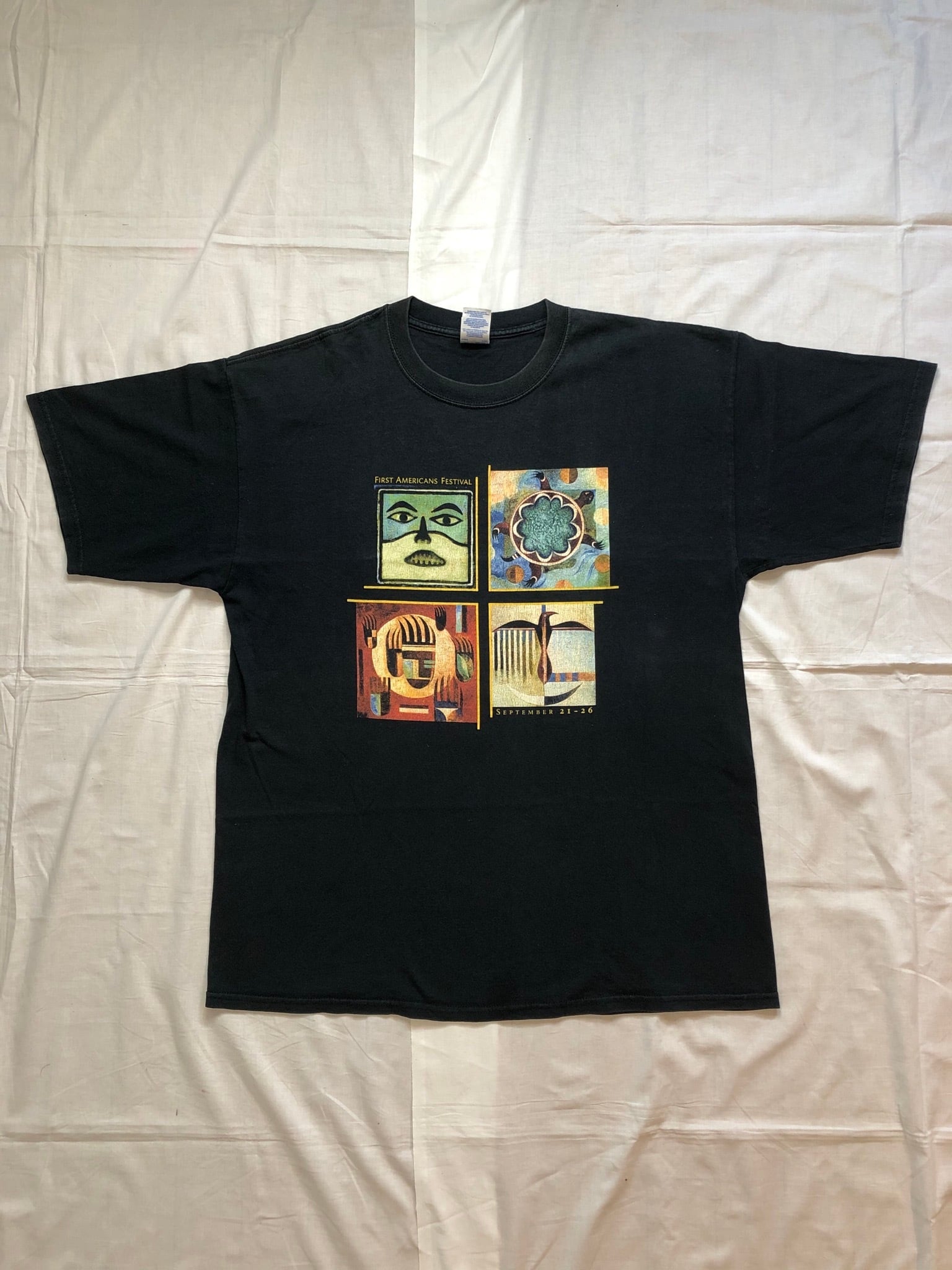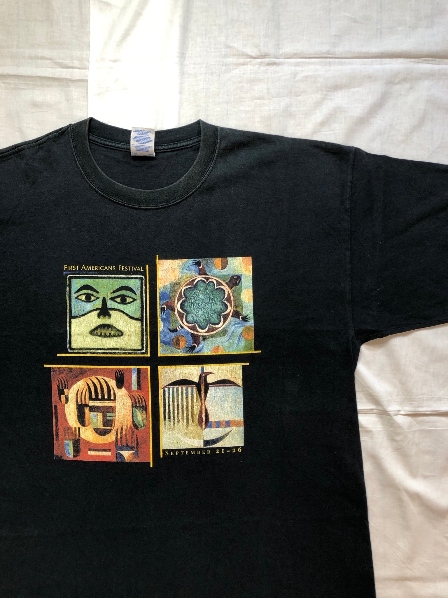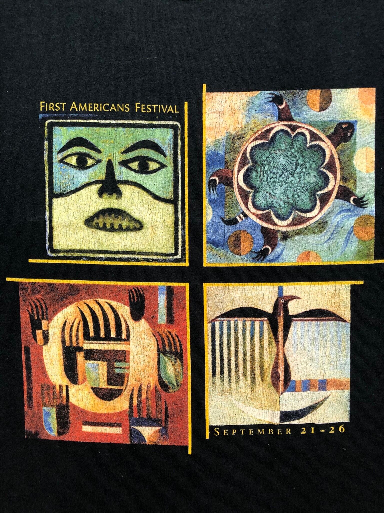 前身頃のプリントに「FIRST AMERICANS FESTIVAL」後ろ身頃に「国立アメリカ・インディアン博物館」文字がプリントされているので、この博物館でネイティブ・アメリカンに関する特別展示などを行った際の記念Tシャツと思われます。