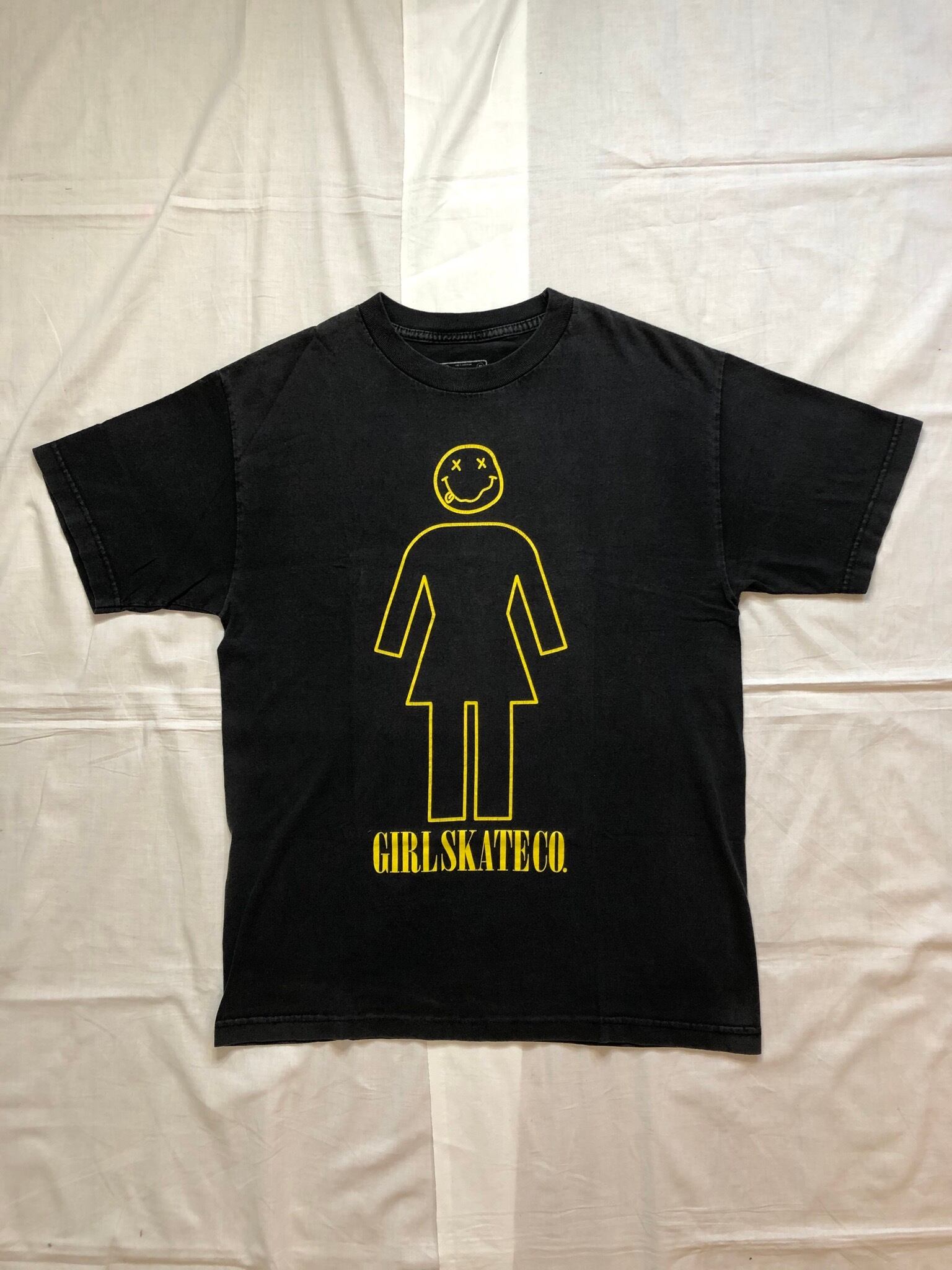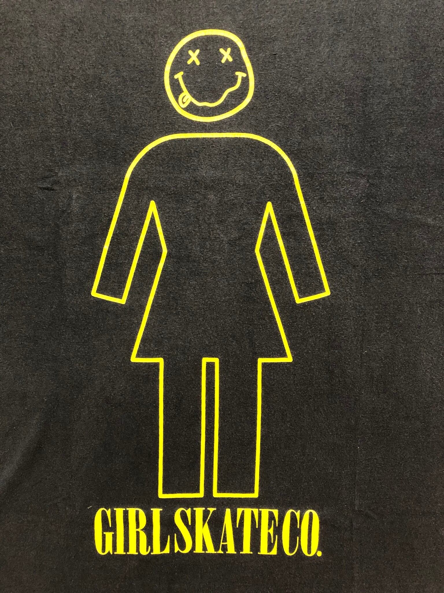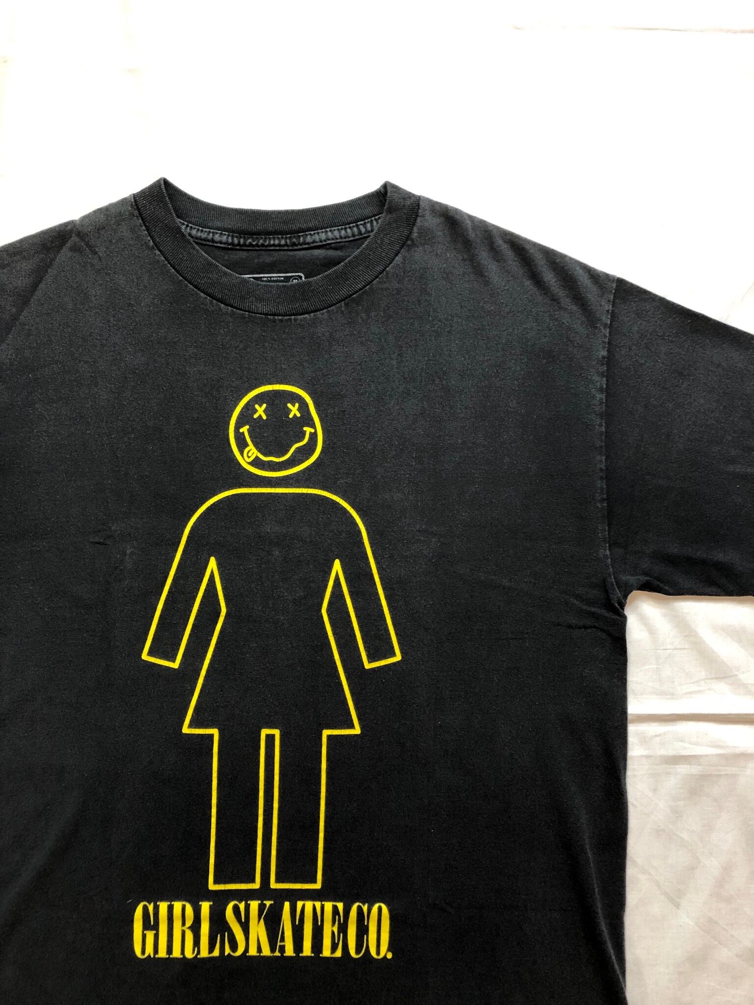 1993年にアメリカで創立したスケートボードのブランド・ガールスケートボードのロゴマークの顔の部分が伝説的ロックバンド・ニルヴァーナのロゴマークになるという、なんとも豪華でセンスのあるプリントです。