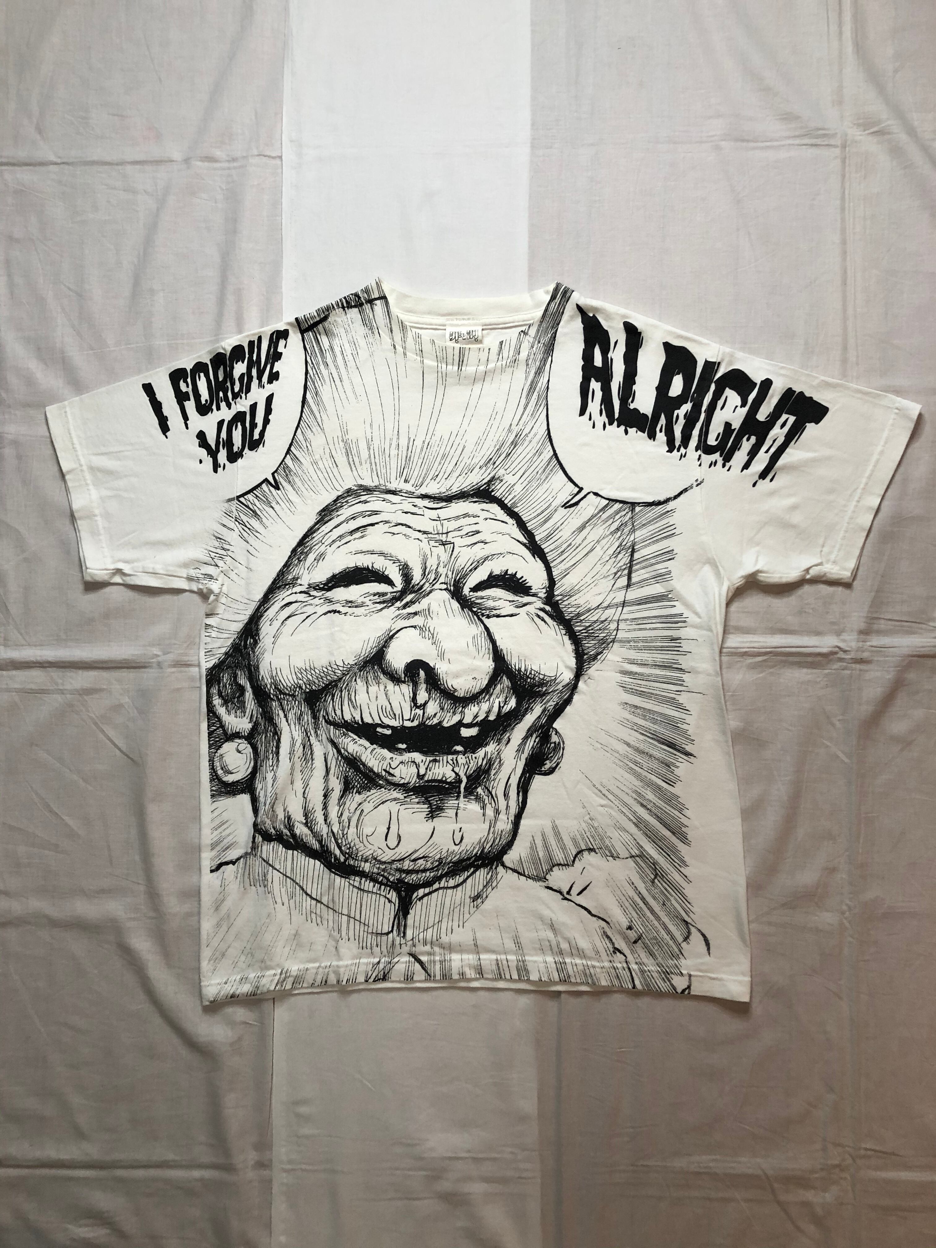 漫☆画太郎氏は独特の作画と世界観で知られていますが、その世界観を余すことなくTシャツの前見頃に表現しています。