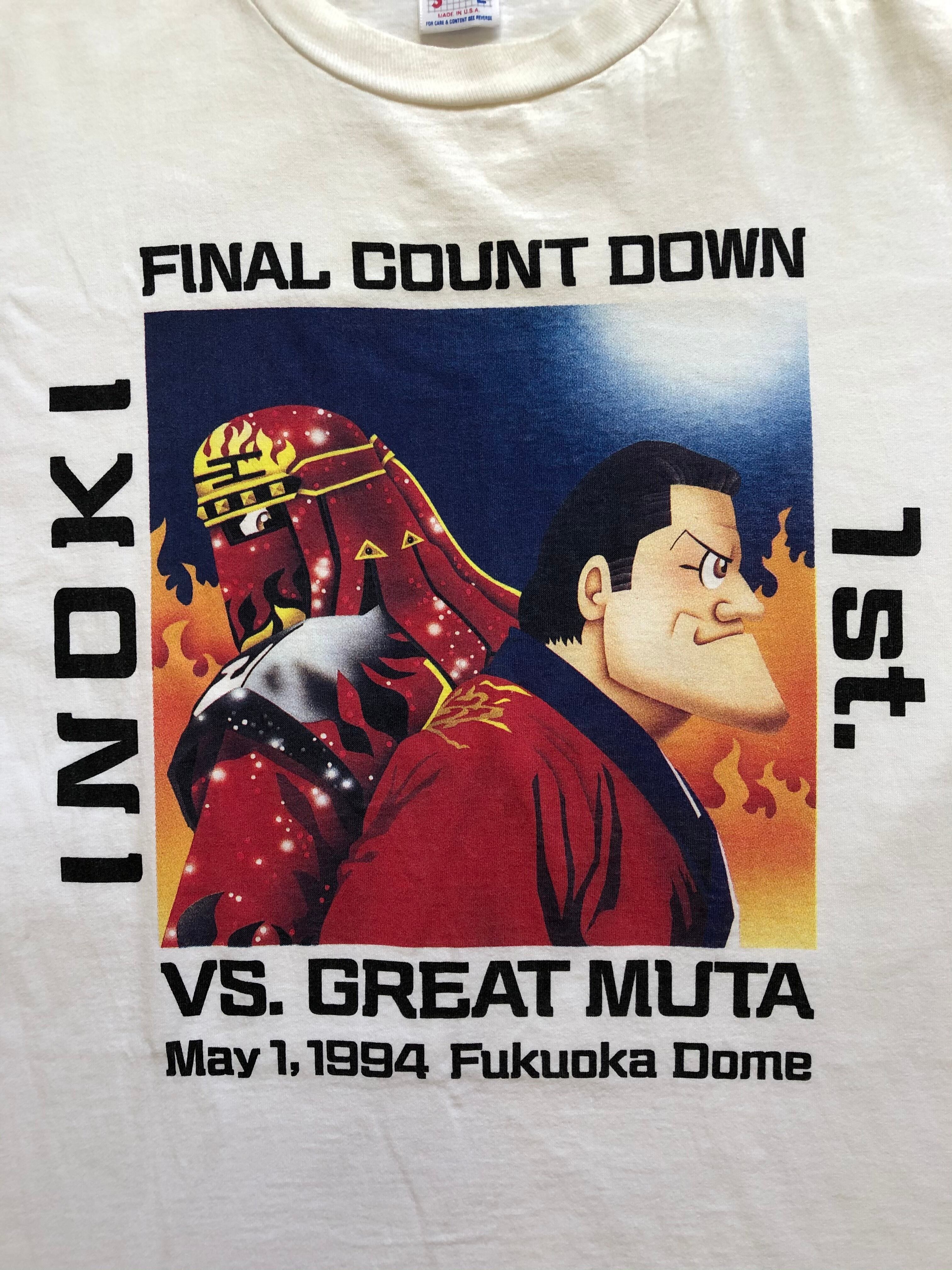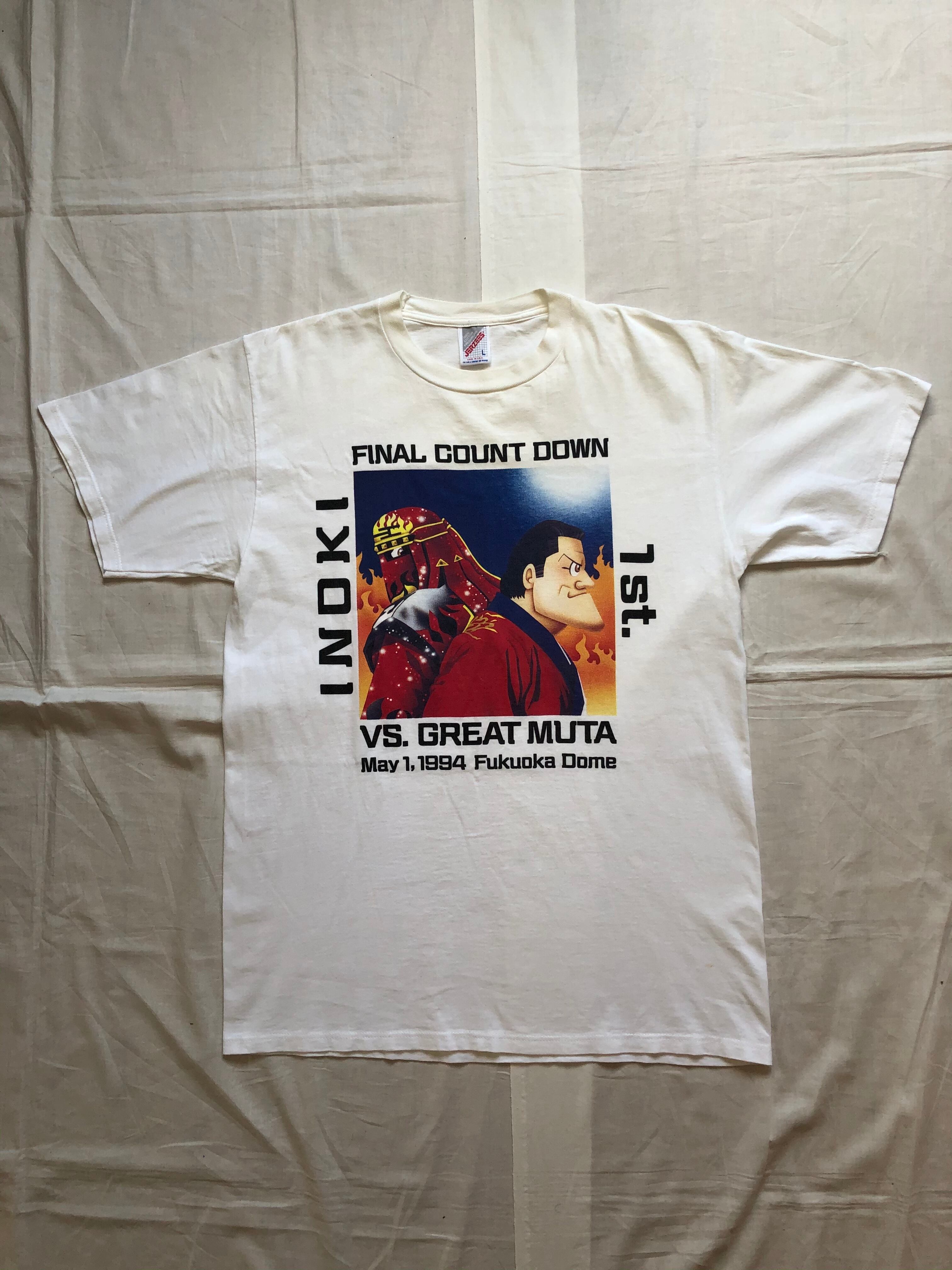 1990年代、プロレスラーのアントニオ猪木とグレートムタ(武藤敬司)の対戦の際に製作されたプリントTシャツです。