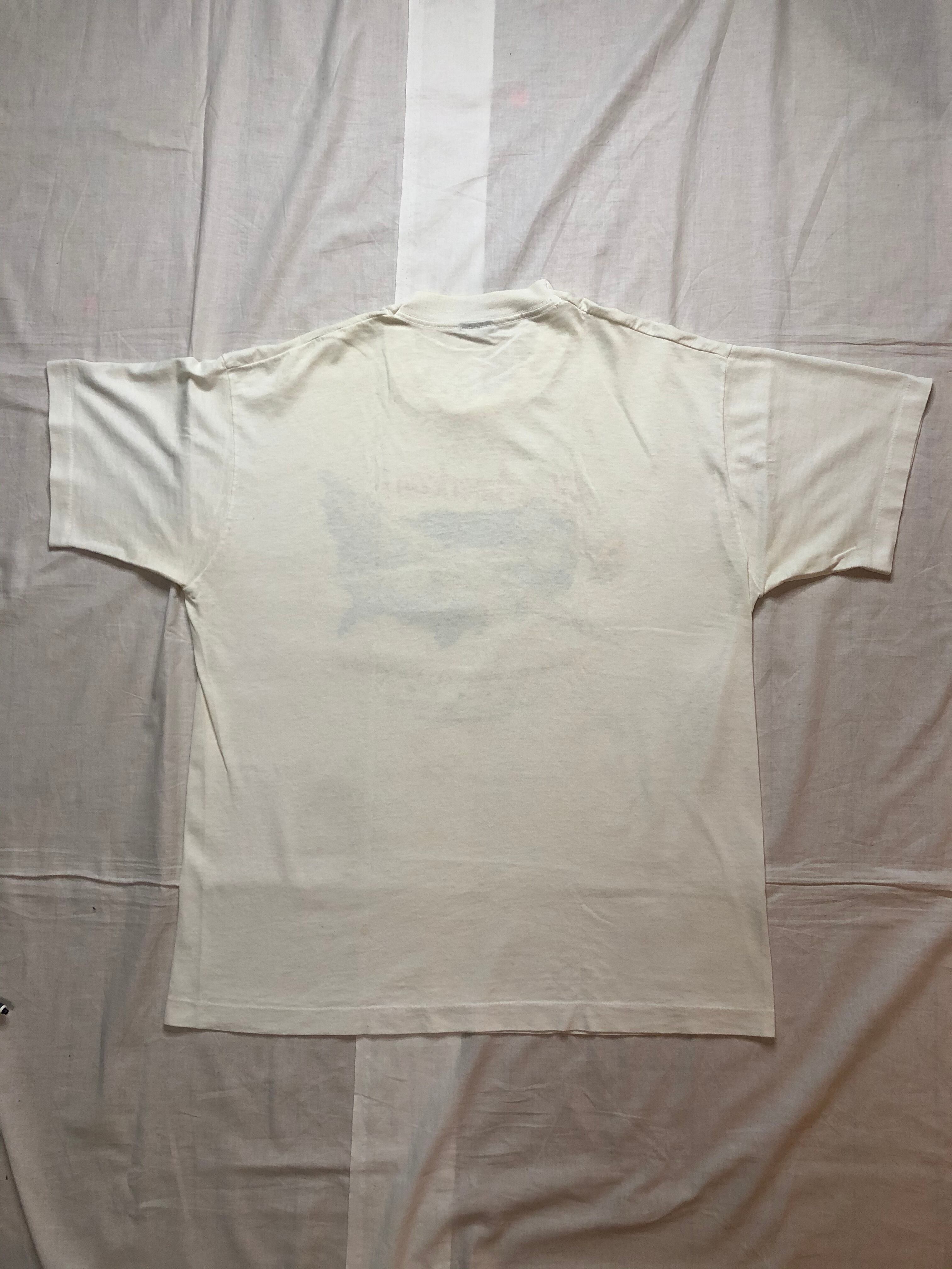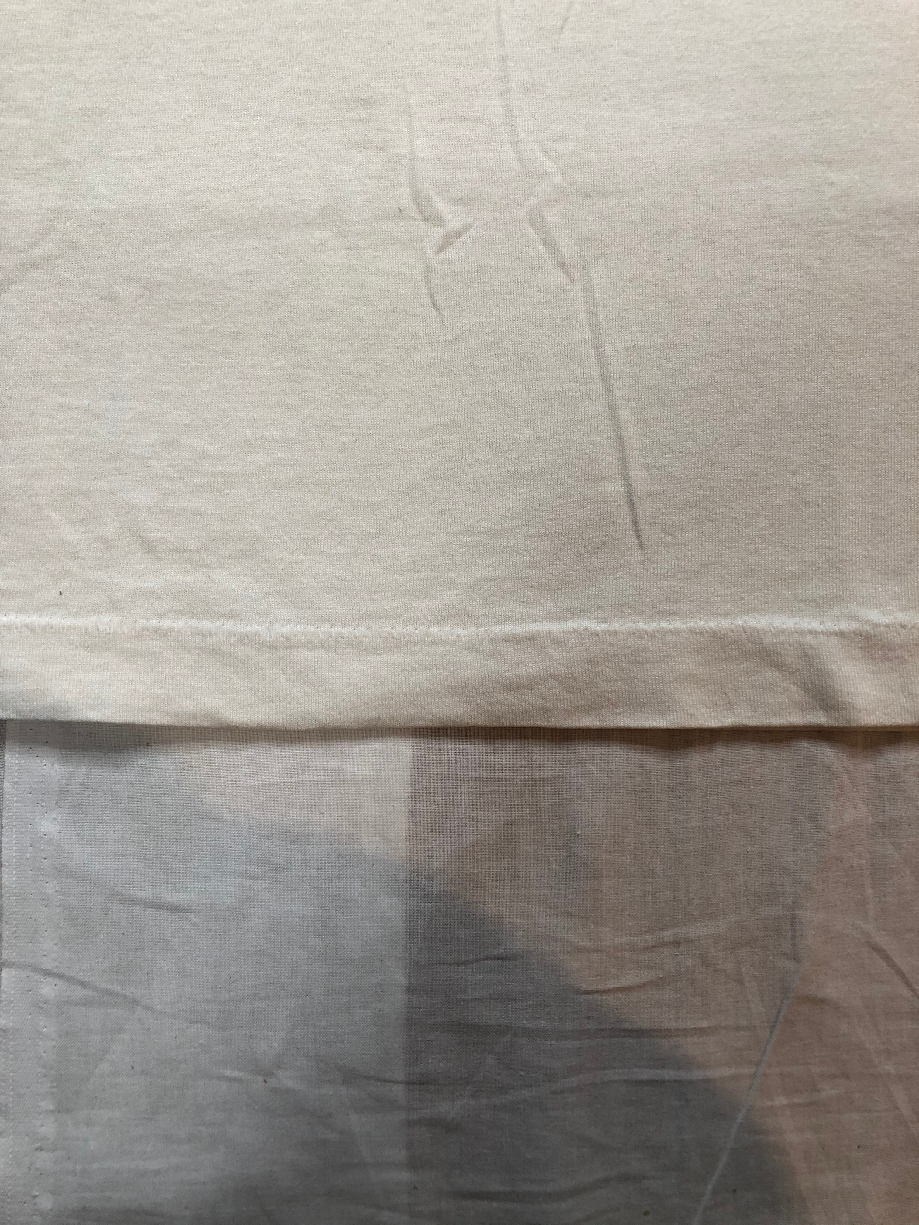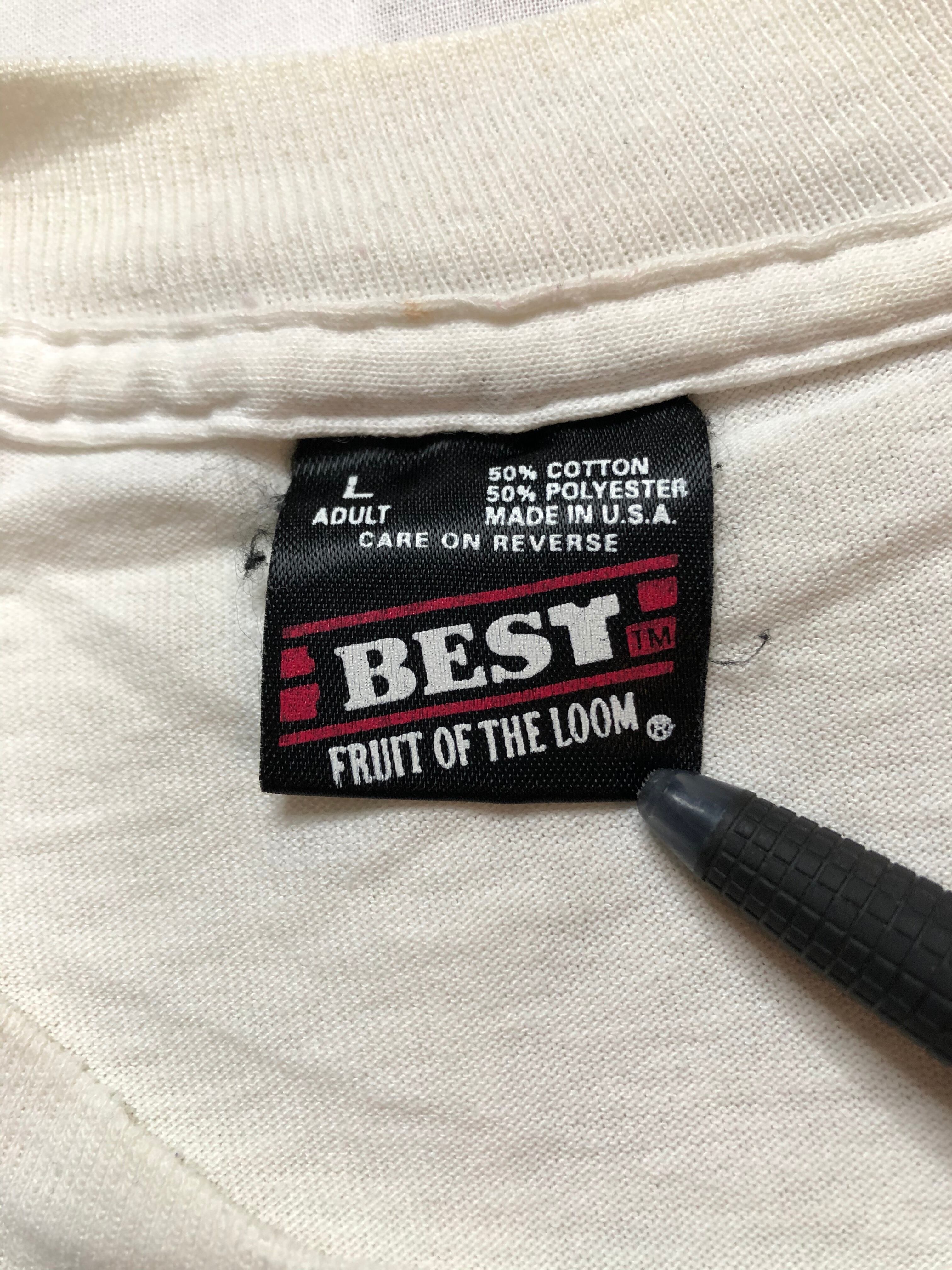 タグは1990年代のFRUIT OF THE LOOMで、生地はコットン50%、ポリエステル50%のいわゆる「ポリ混」生地で、袖・裾ともにシングルステッチです。サイズはLサイズと好条件。
