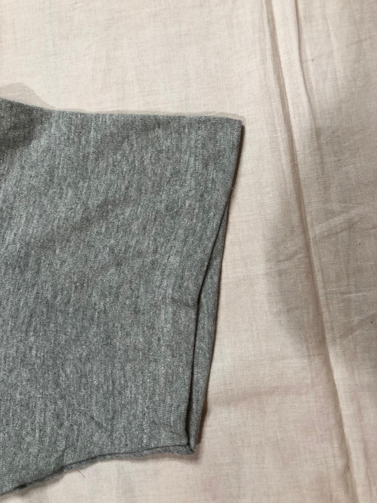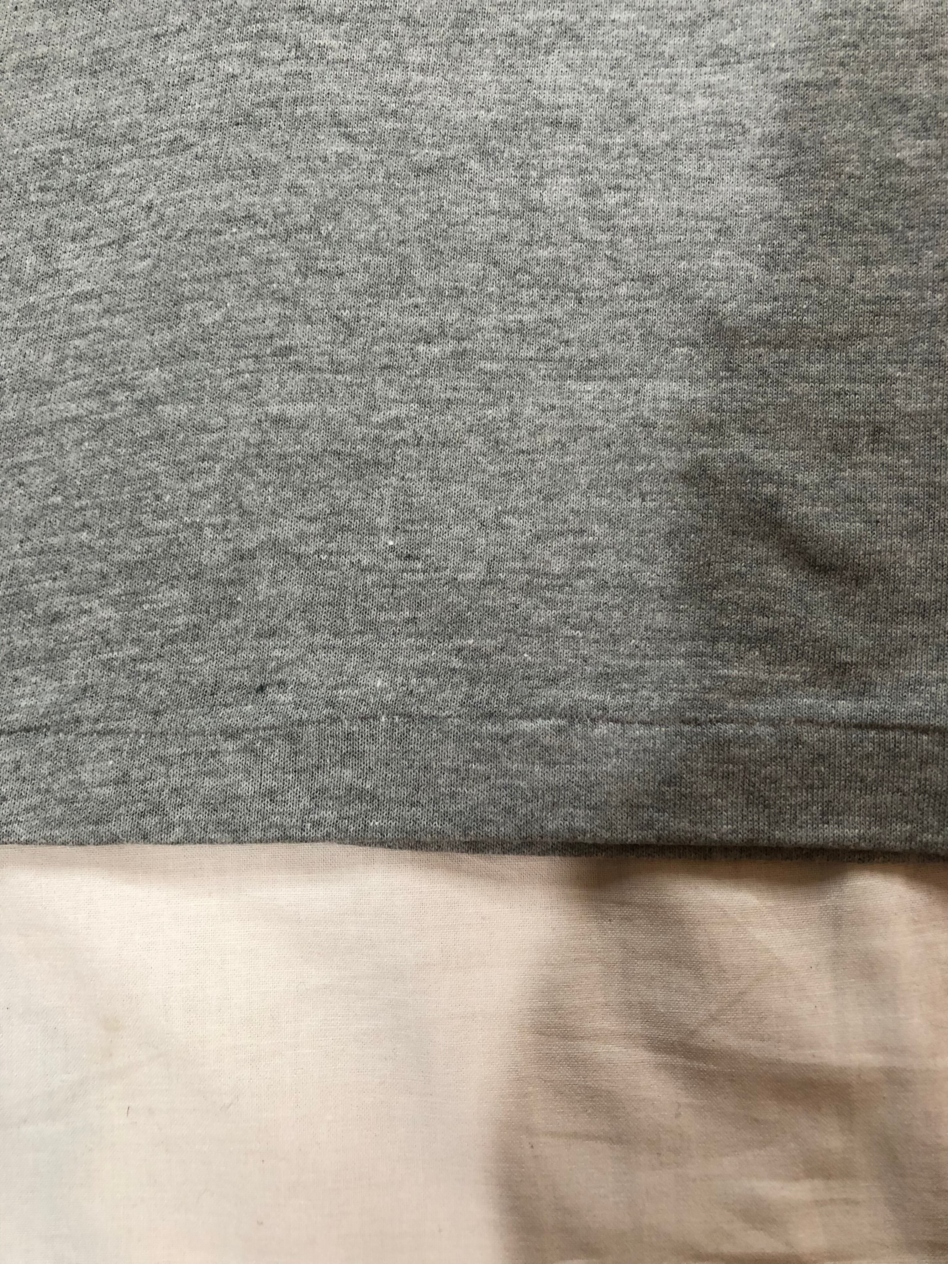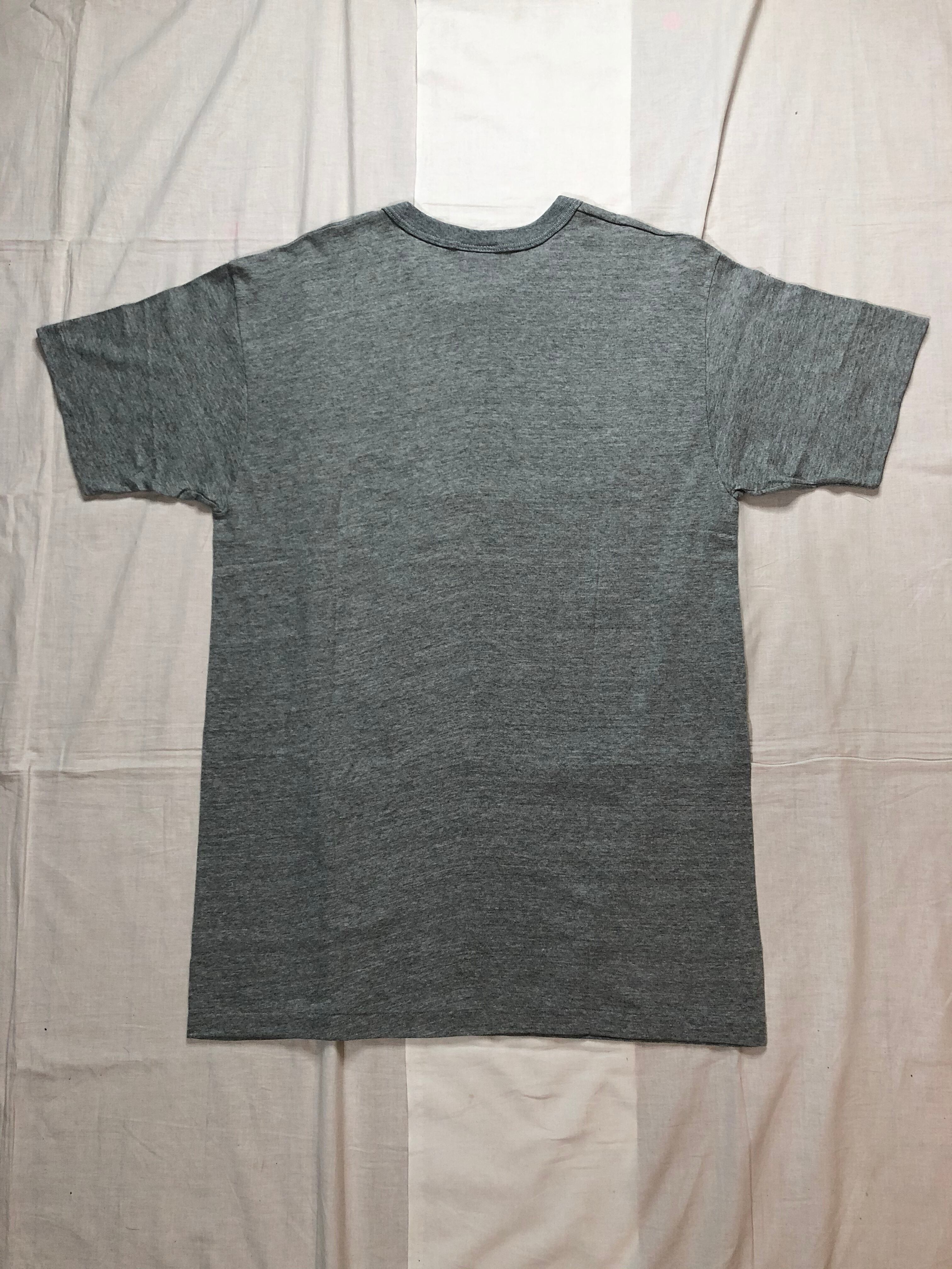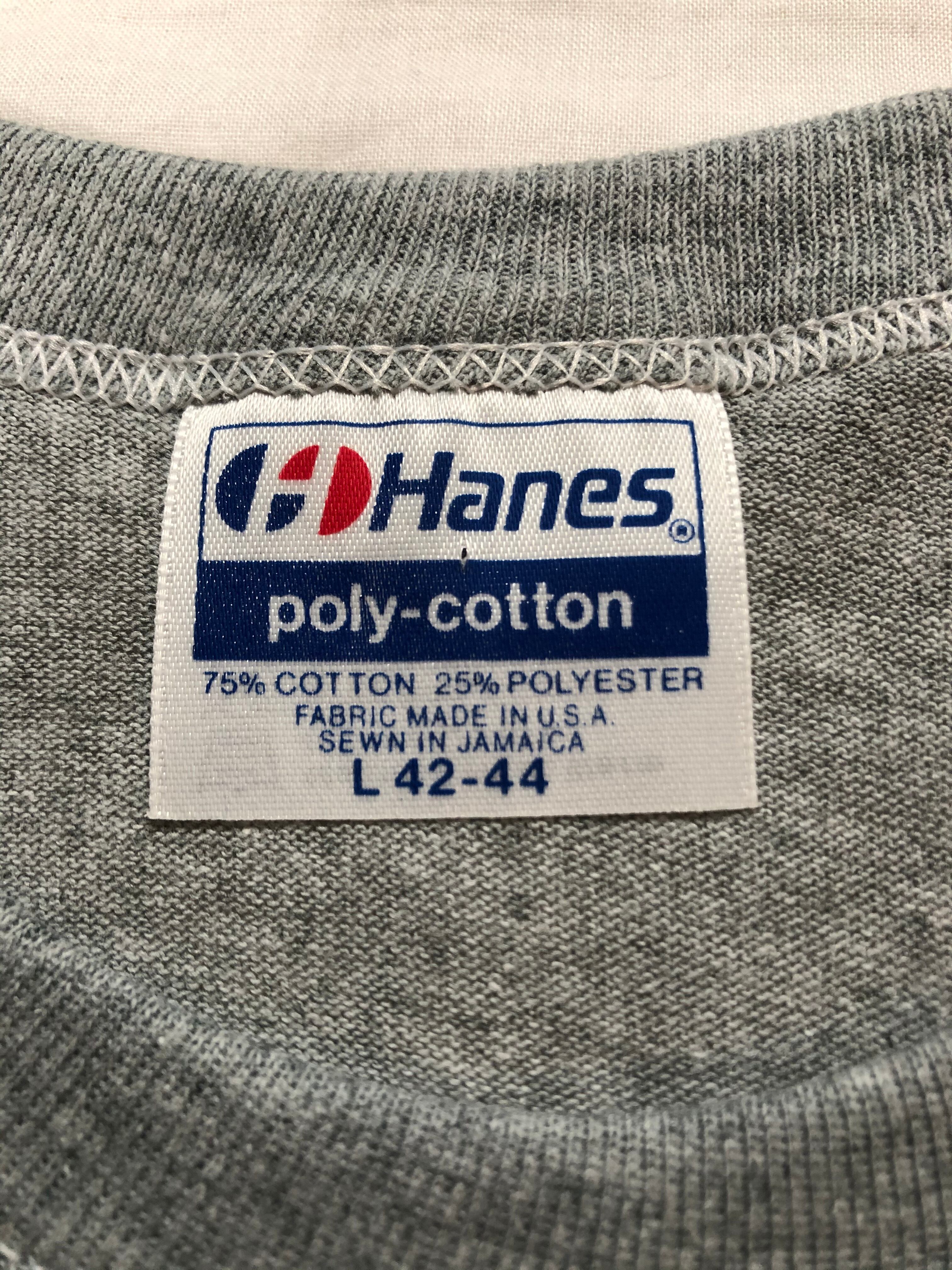 生地はポリ混のHanesで袖・裾はシングル、企業系Tシャツの中でもお洒落なプリントかと思います。