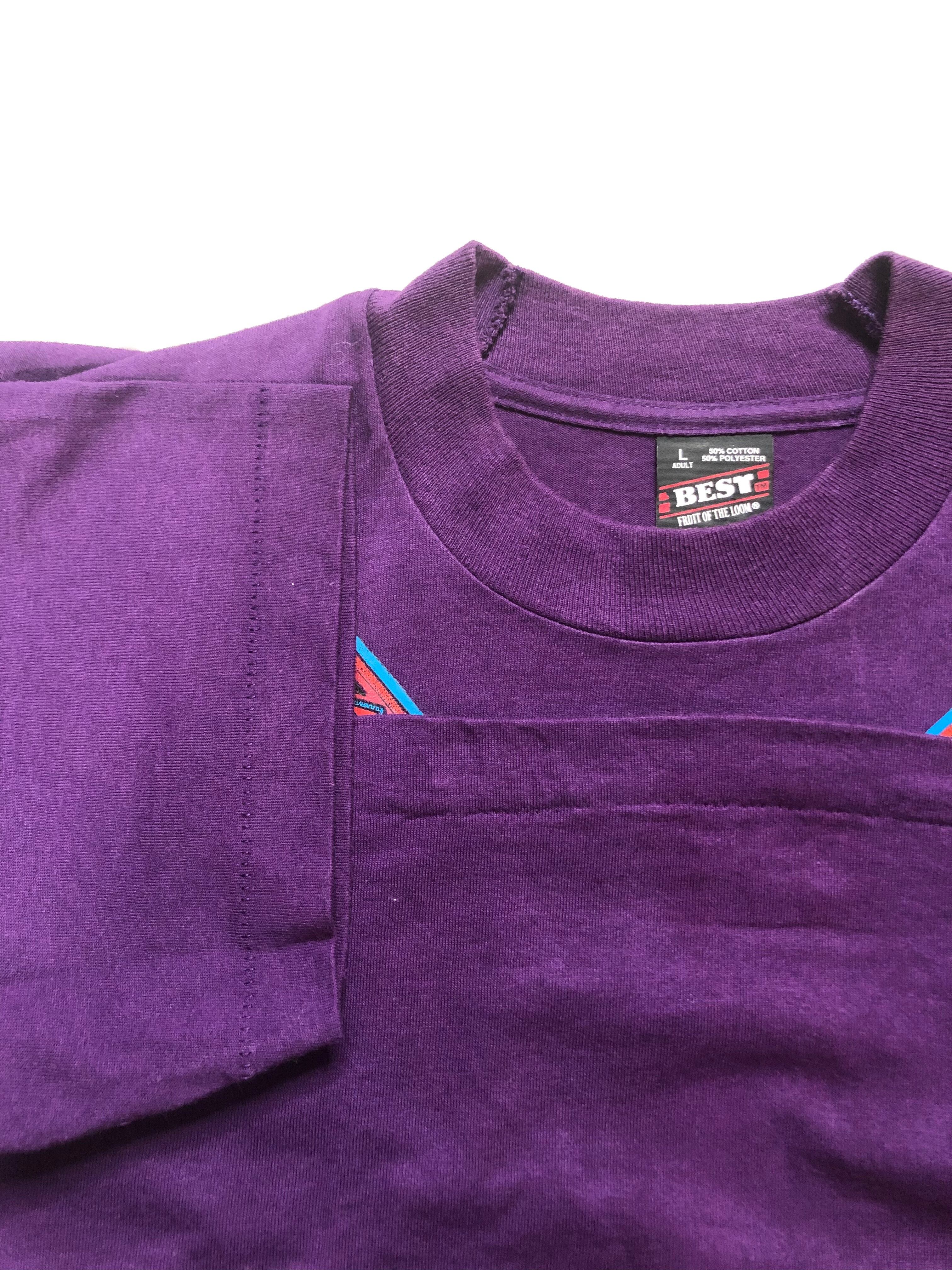 紫色のボディに鮮やかな民族柄のプリントが印象的な1枚です。
