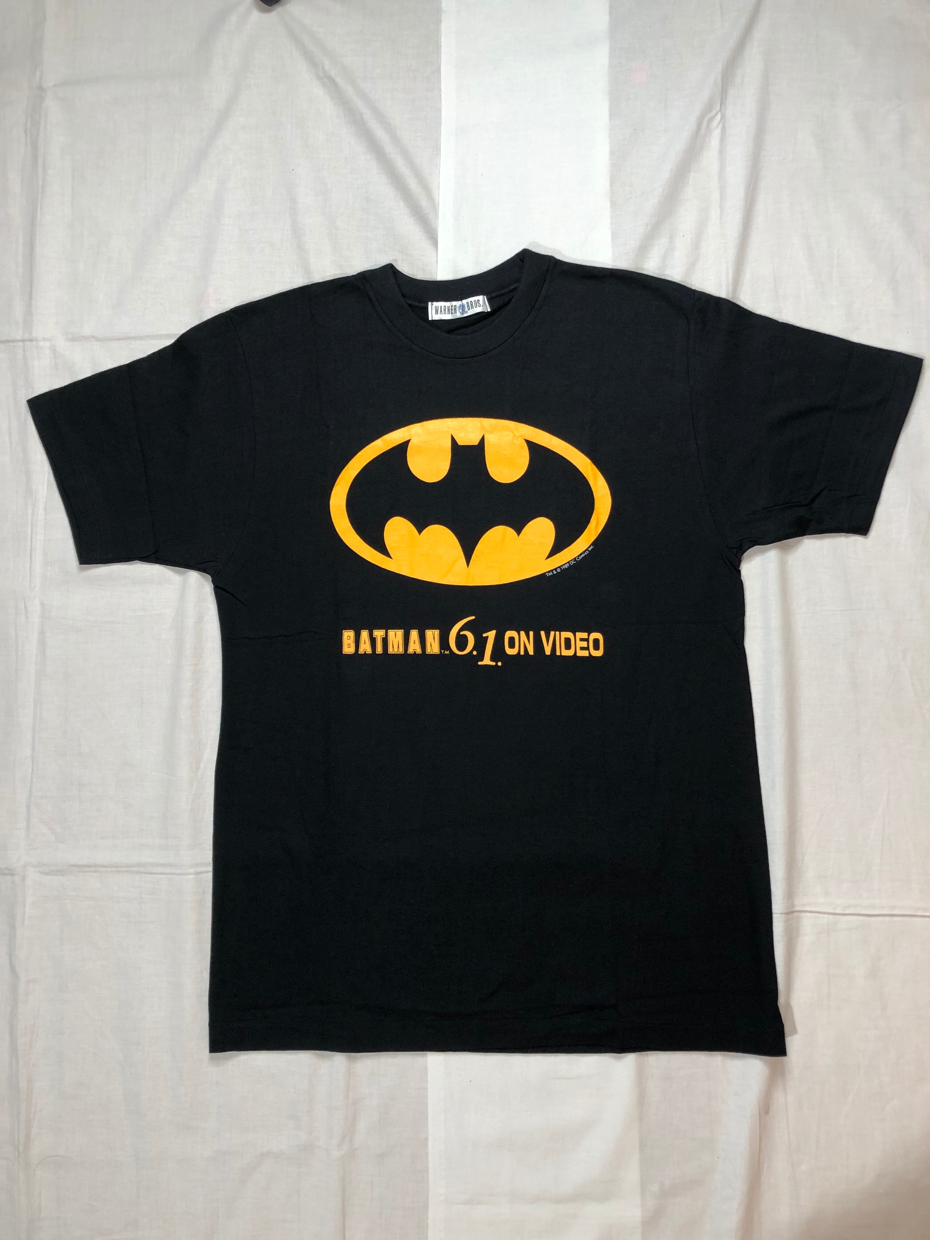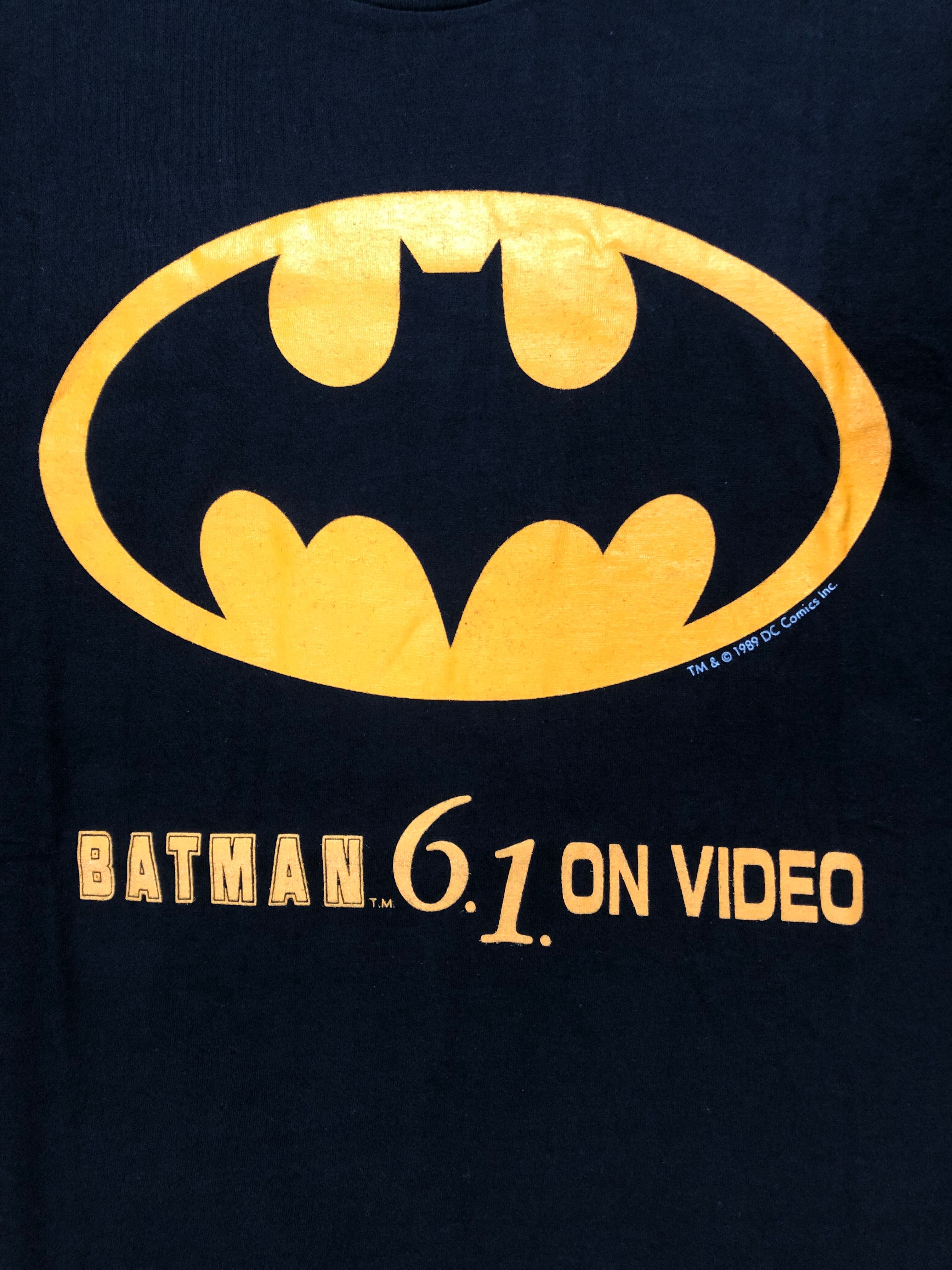 こちらは1989年に公開された映画のビデオ版の販促Tシャツと思われ、「BATMAN 6.1. ON VIDEO 」の文字が書かれています。